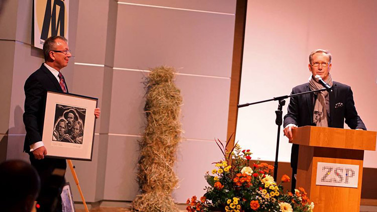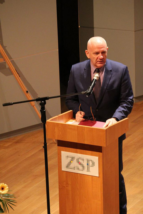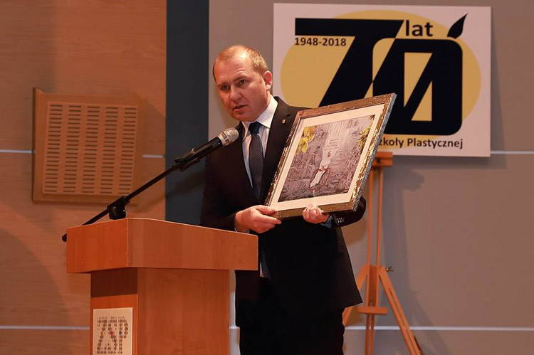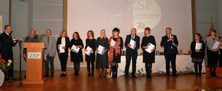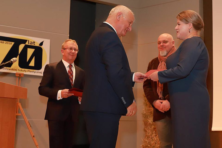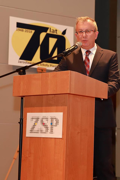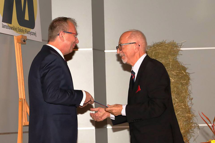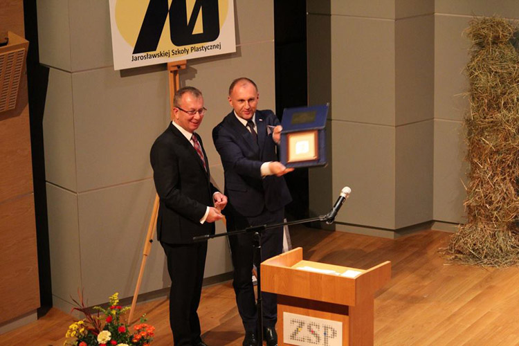 Następnym punktem obchodów jubileuszu 70-lecia szkoły była uroczysta akademia w Sali Koncertowej Państwowego Zespołu Szkół Muzycznych w Jarosławiu. Dyrektor szkoły Jacek Tracz powitał serdecznie licznie zebranych uczestników jubileuszu i gości honorowych, m.in. przedstawiciela Ministra Kultury i Dziedzictwa Narodowego - zastępcę dyrektora Departamentu Szkolnictwa Artystycznego i Edukacji Kulturalnej p. Jarosława Wartaka, wizytatora Centrum Edukacji Artystycznej p. Krzysztofa Szczepaniaka, Wiceburmistrza Miasta Jarosławia dra Dariusza Tracza, Wicestarostę Jarosławskiego p. Mariusza Trojaka, prorektora warszawskiej ASP prof. Wiktora Jędrzejca. W uroczystości uczestniczyli także absolwenci szkoły, m.in. profesorowie ASP z Krakowa, Wrocławia; Wydziałów Sztuki z Uniwersytetu Rzeszowskiego, UMCS-u, dyrektorzy szkół plastycznych z Krosna i Rzeszowa oraz przedstawiciele placówek kulturalnych w Jarosławiu. Część oficjalna składała się z prezentacji historii szkoły i okolicznościowych przemówień oraz wręczenia odznaczeń i nagród nauczycielom Naszej szkoły. Po jej zakończeniu nastąpiła część artystyczna, oparta na fragmentach "Wesela" S. Wyspiańskiego, wzbogacona prezentacją multimedialną i wystąpieniami znanych nauczycieli: Henryka Cebuli i Tadeusza Stefanowskiego.